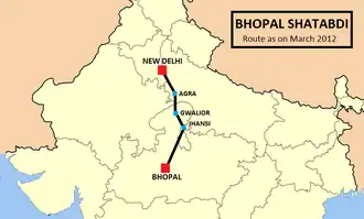 It runs on the New Delhi-Agra stretch.[1][2] The train commenced service in 1988 and was the first Shatabdi train to be introduced. The train runs at an average speed of 82 km/h (51 mph), including halts. There is a plan by the IR to cut short its travel time of 2 hours 06 minutes to 1 hour 35 minutes (95 minutes) in the New Delhi-Agra section at an average speed of 130 km/h (81 mph) when the Maximum Permissible Speed in this section is enhanced to 200 km/h (124 mph). The train was extended to Habibganj Railway Station from 1 September 2014.[3]