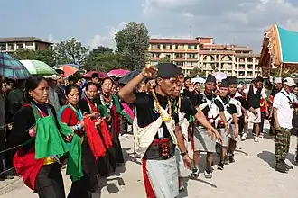 Bhume Naach (also known as Bal puja, Namka Parva, Lokabangey, Jhyamkri rw Balka and Bulku) is one of the festivals celebrated by the Kham Magar people from Lumbini provinces of Nepal.[1] The term Bhume means 'Earth' and Naach means 'dance' in the Nepali language. The Kham people practice a religion that worships the land (bhumi puja), water sprouts (shim), forests (ban puja) and weather, asking for better crop yields and cattle.[2] The May Festival is the main dance performed by the Magars, especially in eastern Rukum and Rolpa. This dance is performed in all parts of Bhume Rural Municipality and Putha Uttarganga Rural Municipality in eastern Rukum, and is also performed in Thabang and Jelbang in Rolpa. This dance is a specialty dance performed in major villages where Parbatey Kham Magar is spoken.[3]