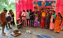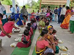 Beneficiary women and children being served midday meal under Mukhyamantri Suposhan Abiyan.