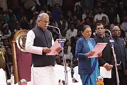 Baghel became MLA from the Patan assembly seat again and became the Chief Minister of the state, defeating BJP’s Raman Singh, after leading the opposition in Chhattisgarh State Assembly for 15 years.[21][22] He took oath as chief minister on 17 December 2018. He was replaced by Kondagaon MLA Mohan Markam as PCC President in June 2019.[23][24]