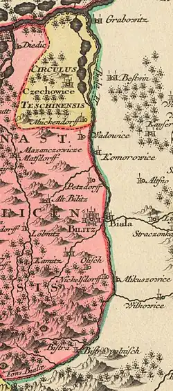 Mieszko I, Duke of Cieszyn, the first ruler of the duchy, died in 1315 and afterwards his sons divided its land into two parts alongside Biała River: diminished Duchy of Teschen to west and Duchy of Oświęcim to east. In the middle of the 15th century Duchy of Oświęcim was bought into the Crown of the Kingdom of Poland and so the river constituted henceforth the border between Polish and the Bohemian Crown (since 1526 part of the Habsburg Monarchy). Upon the First Partition of Poland in 1772 the river ceased to be a state border and continued as a regional border between Austrian Silesia to the west and Galicia to the east. After World War I and the 1919 Polish–Czechoslovak War it separated the Polish part of Cieszyn Silesia in the Autonomous Silesian Voivodeship from Lesser Polish Kraków Voivodeship.