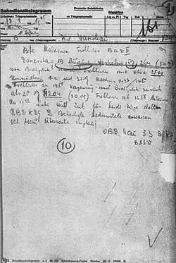 The Aktion was followed by the murder of about 300 Jewish intellectuals who were trucked to the Pietrasze fields on July 3.[4] Battalion 309 left for Białowieża, and was replaced by Order Police Battalion 316 and 322 of Police Regiment Centre and were ordered to round up more Jews. On July 12–13, 1941, a mass shooting by the two battalions dubbed "Black Saturday" took place on the outskirts of Białystok.[4] It is estimated that over 3,000 Jews herded into the municipal stadium – visited by Erich von dem Bach-Zelewski himself – were taken away and killed in antitank trenches.[8][9] The total of over 5,500 Białystok Jews were shot in the first weeks of German occupation in the summer of 1941.[4]