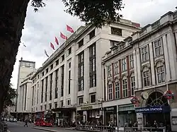In 1973, Dorothy Perkins was bought by British Land, this gave British Land a 70% ownership of Biba.[4] The store moved to the seven-storey Derry & Toms department store on Kensington High Street, which immediately attracted up to a million customers weekly, making it one of the most visited tourist attractions in London.[3][16] There were different departments, and each floor had its own theme, such as a children's floor, a floor for men, a book store, a food market, and a "home" floor which sold items such as wallpaper, paint, cutlery, soft furnishings and even statues. The overall design was produced by Whitmore-Thomas Partnership, run by artist/designers Steve Thomas and Tim Whitmore.[17] Each department had its own logo or sign, which was based on the Biba logo and had a picture describing the department. These were commissioned by Thomas and Whitmore and designed by Kasia Charko.[18]