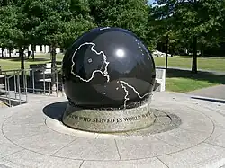 The World War II Memorial features a plaza that contains ten pillars etched with images and descriptions of the war relevant to the state. The pillars on the east represent events from the European and Mediterranean and Middle Eastern theaters, and the western pillars represent events from the Pacific Theater.[13] The memorial also contains a 18,000 lb (8,200 kg) granite globe suspended by water, and a bench with the names of the seven recipients of the Medal of Honor from Tennessee.[10] The surface of the plaza contains gold stars honoring the 5,731 Tennesseans who died during the war. A time capsule on the plaza will be opened on November 11, 2045.[13]