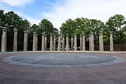 Directly north of this is the Tennessee Amphitheater, a 2,200-seat terraced amphitheater used for special events.[9] It is patterned off of the Ancient Theatre of Epidaurus.[10] The northern end of the park features the Court of 3 Stars, a circular plaza made of red, white, and blue granite arranged in the tri-star logo found on the Flag of Tennessee. These stars represent the three Grand Divisions of Tennessee. Surrounding the plaza are 50 columns containing a 95-bell carillon, representing the 95 counties of the state and the state's contribution to the development of American popular music.[1][7] The carillon plays a part of the Tennessee Waltz every fifteen minutes, and the entire song each hour.[10] A 96th bell housed on Capitol Hill joins in at the top of each hour; the bell is meant to represent the government’s commitment to the people.[10]