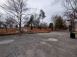 The eastern outer path is the Walkway of Counties, which represents the state's geography from east to west. The planters next to the walkway highlight the state's diverse topographical landforms, and feature flora from across the state's respective regions.[7] Accompanying these are granite obelisks which provide descriptions of the state's nine physiographic regions. An obelisk detailing the history of the Tennessee State Capitol is also located along here.[8]