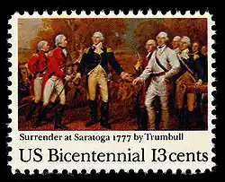 A painting-format stamp was issued January 3, 1977 for Washington's successful battle at Princeton.[1] Similarly painting stamps were issued to commemorate the Battle of Oriskany and the Battle of Saratoga. Four stamps were issued on July 4 to honor craftsmen with the legend "Skilled Hands for Independence". Additional stamps honored the Articles of Confederation and the arrival of Lafayette. One of the Christmas stamps that year, though not formally part of the series, showed Washington kneeling at Valley Forge.