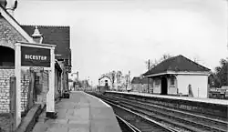 The Buckinghamshire Railway, which already had a route between Bletchley and Banbury, had powers to build a line to Oxford. The first part of this line, which ran from a junction to the west of Winslow (at a point which became known as Verney Junction) to Islip, opened on 1 October 1850, and this included a station at Bicester.[2][3] (At its maximum extent, the line extended from Oxford to Cambridge and thus became known as the Varsity line). Originally named "Bicester", the station was renamed "Bicester London Road" in March 1954,[3] although the nameboards were not altered until 20 September 1954.[4]