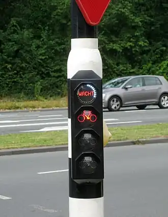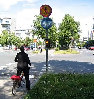 Cyclists in some countries are also given separate rules and light phases at traffic signals and cyclist-specific traffic lights. For instance, in Germany and elsewhere at junctions with segregated facilities all the traffic in a given direction (motorists, pedestrians and cyclists) may get a green signal at the same time.[8] Turning motor traffic is obliged to wait for cyclists and pedestrians to clear the junction before proceeding. In this situation all the transport modes get equal green time. In contrast, UK and Irish practice restricts pedestrians to a dedicated signal phase, separate from and usually much shorter than the green phase for motorists (e.g. 6–12 seconds, vs. signal cycle times of up to 120 seconds).[9][10] If cyclists were to be segregated and treated in a similar manner this would imply a significant reduction in green time for cycle traffic at every junction. In the English city of Cambridge the use of cyclist-specific traffic signals is reported to have resulted in increased delays for cyclists, leading some to ignore the cycle-facilities and stay on the road.[11] A similar example occurred in a Parisian bikepath scheme in 1999. Cyclists faced twice the number of traffic signals as motorised traffic and were expected to wait over one minute to get seven seconds of green time.[12] Conversely, in Copenhagen cyclist-specific traffic signals on a major arterial bike lane have been linked to provide green waves for rush hour cycle-traffic, which time the lights so cyclists going an average speed are much more likely to encounter green lights on their trip.[13]