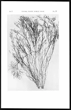 Plants gregarious, olivaceous, firm in texture, black and brittle when dried, exceeding 4 dm in height, the basal holdfasts small, irregularly lobed; branching close to the base into several main axes which are about 1.0-1.5 mm diam., and which branch irregularly into smaller divisions, especially above bearing scattered lateral determinate aculeate to filiform branchlets 1-3 cm long; above irregularly dichotomously branched, the sterile divisions slender, near the top somewhat fastigiate; fertile branches dichotomously or sometimes laterally branched, the divisions nodulose, to 2.5 mm diam., tapering, the conceptacles hermaphrodite, the oval sporangia 133-200 μ long, 46-80 μ diam., each producing one egg.[2]