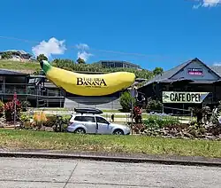 The Big Banana is a tourist attraction and amusement park ('The Big Banana Fun Park') in the city of Coffs Harbour, New South Wales, Australia. The grounds of the park are set amongst a banana plantation, featuring a large walk-through banana. Built in 1964, it was one of Australia's first Big Things. Other attractions include a downhill toboggan ride, ice skating rink, XD Theatre, Mini Golf, Giant Slide, Laser Tag, a water park, the World of Bananas educational experience, and escape rooms. Plantation tours are also available.[1] On the evening of Australia Day 2014, a disused scenic lookout attraction was destroyed by fire.[2] In keeping with the plantation theme, banana-related products are shown or sold in the park which also has a souvenir shop and restaurant.[3] In January 2014, during the peak tourist season the Big Banana received close to 150,000 visitors.[4] The Big Banana has been a family owned business since it was opened by Betty and John Landi, and Stella and John Enveoldson in 1964.