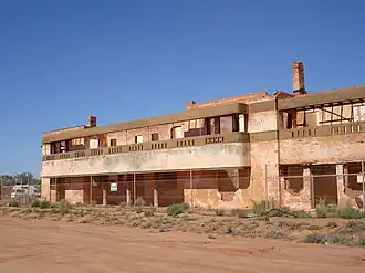 The Big Bell Hotel was constructed and opened in 1937. It was a classic art deco style of the period, but is now a ruin.[4] The large two storey building of brick construction has brick colonnading to the north and east facades and a curved corner and once had a tiled roof.[1] The hotel was reputed to have the longest bar in Australia.[5]
