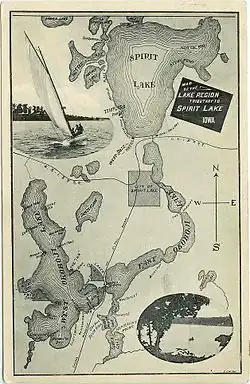 Big Spirit Lake is a natural body of water, approximately 5,684 acres (2,300 ha) in area, in Dickinson County in northwest Iowa in the United States. It is part of the chain of lakes known as the Iowa Great Lakes, the northern shore of the lake straddles the border with Minnesota. It is the largest natural lake in Iowa. The Dakota name for the lake was Minnewaukon. Early French traders named it Lac d'Esprit after the Native legends of an evil spirit who dwelled in the lake.