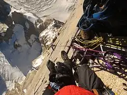 Big wall climbing is rock climbing on large routes that often take a full day, if not several days, of continuous climbing to ascend. Big wall climbing is a form of multi-pitch climbing but there is no definition of how many pitches are needed for a route to be a big wall; a minimum of at least 6–10 pitches (or roughly 300–500 metres) is typically required. Big wall climbing is usually done in pairs as lead climbing, however, due to the length of the climbs, the second climber usually ascends via a fixed rope to save energy and time.[1][2]