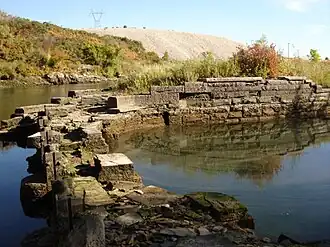 The structure includes a diversion dam extending at an angle into the river to divert water through the headgate into a canal flowing parallel to the river. The headgate structure was built of dressed local limestone, and is 35 feet (11 m) wide, allowing a designed flow of 720 cubic feet (20,000 L) of water per second. Five iron gates controlled the flow. The headgate structure is intermittently inundated by water held in the Yellowtail Dam Afterbay reservoir.[4]