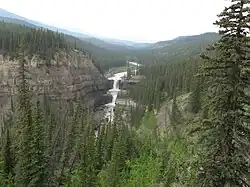 Flowing under Mount McGuire, Bighorn River soon takes on Littlehorn and Sunkay Creeks, before plummeting over the impressive Crescent Falls. After the falls, the Bighorn travels through a significant canyon, before passing through the Bighorn Indian Reserve. The river then empties into the North Saskatchewan River after Lake Abraham.[3]