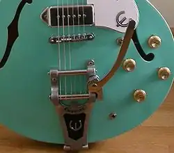 The Bigsby vibrato tailpiece (or Bigsby for short) is a type of mechanical vibrato device for electric guitar designed by Paul Bigsby and produced by the Bigsby Electric Guitar Company (currently an independently operated subsidiary of Fender Musical Instruments Corporation). The device allows musicians to bend the pitch of notes or entire chords with their pick hand for various effects.[1]