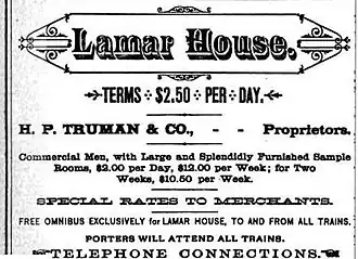After Sneed died in 1869, his children inherited the Lamar House, and over the next two decades, the hotel once again developed into the preferred gathering place for Knoxville's elite. The hotel's status was enhanced by the construction of Staub's Theatre— Knoxville's first opera house— across the street in 1872. Masquerade balls were held regularly in the hotel's ballroom, with cigars, imported wines, and oysters served. Frequent attendees included author Frances Hodgson Burnett (whose brother worked as a bartender at the hotel) and artist Lloyd Branson. President Rutherford B. Hayes stayed at the hotel during his visit to Knoxville in September 1877.[2][5] General James Holt Clanton died at the Lamar House on September 27, 1871, after being wounded in a shootout with attorney David Nelson.[6][7]