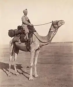 The Corps was founded by Maharaja Ganga Singh of the Indian state of Bikaner, as the Ganga Risala after the British government of India accepted his offer to raise a force of 500 soldiers. The state of Bikaner had a long tradition of using soldiers mounted on camels. For instance, in 1465 Rao Bika led a force of 300 sowar (or camel riders) to conquer neighbouring territories.[1] Ganga Singh led the Ganga Risala when it fought in the Boxer Rebellion in China in 1900, in Somaliland in 1902-1904 in failed effort at defeating the Somali Uprising and in Egypt in World War I. At the Suez Canal in 1915 the corps routed the opposing Turkish forces in a camel cavalry charge.[2] The Corps fought in the Middle East in World War II, when it was supported by the camel-mounted Bijay Battery, which became a mule team battery.