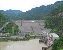 The Bikou Dam (Chinese: 碧口水电站) is an embankment dam on the Bailong River just upstream of Bikou in Wen County, Gansu Province, China. Construction on the dam began in 1969, the generators were commissioned in 1976 and the dam was complete in 1977. The 101 m (331 ft) tall earth-core rock-fill dam creates a reservoir with a 521,000,000 m3 (422,382 acre⋅ft) capacity. The dam supports a 300 MW power station.[1][2][3] The dam sustained some damage from the 2008 Sichuan earthquake.[4]
