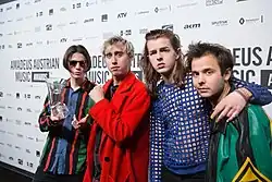 Bilderbuch (English: "Picture Book") is an Austrian rock band and was formed in Kremsmünster, Austria in 2005 but has been based in Vienna since 2008. The current band members are Maurice Ernst (vocals, guitar), Peter Horazdovsky (bass), Michael Krammer (guitar) and Philipp Scheibl (drums). The band has released 7 albums as of 2022. The band began with indie rock, but over the years increasingly adopted elements of hip hop, electronic music and various pop styles.[1]
