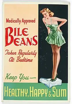Bile Beans was a laxative herbal tonic first marketed in the 1890s.[1][2] The product supposedly contained substances extracted from an extremely rare vegetable by a fictitious chemist known as Charles Forde.[3] In the early years, Bile Beans were marketed as "Charles Forde's Bile Beans for Biliousness", and sales relied heavily on newspaper advertisements. Among other cure-all claims, Bile Beans promised to "disperse unwanted fat" and "purify and enrich the blood".[4]