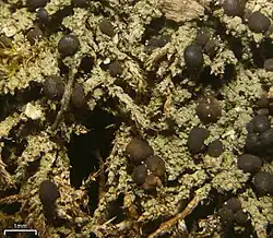 The reproductive cells (asci) each produce eight spores and have a distinctive structure that shows complex staining patterns when treated with iodine and potassium hydroxide solution. The spores themselves are colourless and elongated, with 0 to 7 (rarely up to 9) cross-walls (septa), and often have a rough outer coating. The genus may contain a secondary metabolite, called zeorin, though many species lack any detectable secondary compounds. Various olive-green and brown pigments occur throughout the fungal tissues, though these remain chemically uncharacterised.[9]