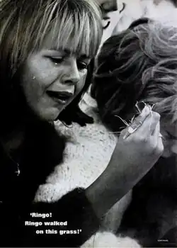While still free-lancing Ray took photos of jazz bassist, Charles Mingus at a club in Greenwich Village and Elvis Presley just before his departure to serve as an Army Private in Germany.[8][9] A year later he did a photo shoot of Alan Freed's last television show as a payola scandal ended his career as a rock and roll disk jockey.[10] In what would eventually become the most famous of his photo assignments, Ray worked his way backstage onto a catwalk to shoot Marilyn Monroe in a skintight dress signing the happy birthday song to John F. Kennedy on the occasion of his forty-fifth birthday at Madison Square Garden in 1962.[11][1] [note 3] In 1963 Ray moved from New York to become a staff photographer in Life's Beverly Hills office.[13] Soon after arriving he spent two months photographing the actress, Natalie Wood.[13] A year later he took an arresting photo of a Beatles fan as the foursome arrived in Los Angeles for a west coast concert tour (shown at left).[14] It showed a tearful girl holding a clump of grass and had the caption ""Ringo! Ringo walked on this grass!"[note 4] That year he also produced a photo essay on the founder of Japan's largest consumer electronics company, Konosuke Matsushita.[16]