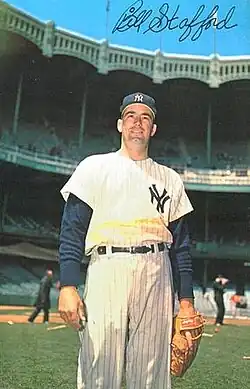 William Charles Stafford (August 13, 1938 – September 19, 2001) was a professional baseball player who pitched in the Major Leagues from 1960 to 1967. Stafford was a successful pitcher for the New York Yankees from 1961 to 1962, winning a combined 28 games in two seasons. He appeared in the World Series 3 times for the Yankees from 1960 to 1962, and was the winning pitcher in Game 3 of the 1962 World Series versus the San Francisco Giants. In September 2001, Stafford died in his home at the age of 63 of a heart attack.