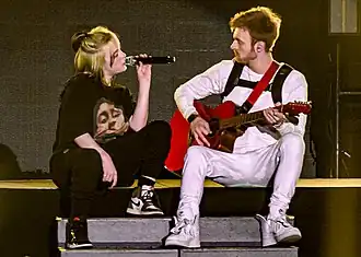 Eilish and her brother, Finneas, collaborate on songwriting.[194][195] Finneas writes for Eilish's albums, produces her music, and also performs in live shows.[196][194] Eilish and Finneas "like to completely make up things and become characters" and "have songs that are really fictional".[195] Eilish said a number of the songs also derive from her and Finneas' experiences.[195] They try to write "really interesting and conversational" lyrics: "We try to say stuff that doesn't have to be that deep [...] but you say something way deeper in a certain way that makes sense, but you haven't really thought about."[195] Finneas has said that when he writes for his sister, he aims to "write [songs] that I think she'll relate to and enjoy singing and empathise with the lyrics and make her own".[197] When he writes with Eilish, he tries "to help her tell whatever story she's trying to tell, bounce ideas off of her, listen to her ideas", and use a language that fits her voice telling the story.[197]