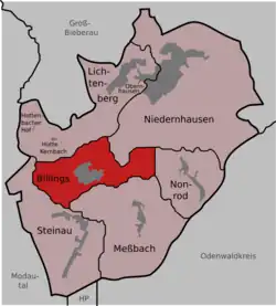 Billings (German pronunciation: [ˈbɪlɪŋs]) is a village located south of Frankfurt am Main in the southern part of the German state of Hessen. It has been incorporated into the municipality of Fischbachtal in the district of Darmstadt-Dieburg.