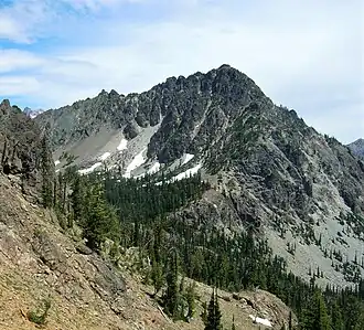 Bills Peak is a 6,917-foot (2,108-metre) mountain summit located on the common border of Kittitas County with Chelan County in Washington state. It is the tenth-highest point in the Teanaway area of the Wenatchee Mountains.[1] Bills Peak is situated 2.6 mi (4.2 km) west-northwest of Earl Peak, its nearest higher neighbor, on the boundary of the Alpine Lakes Wilderness, on land managed by Wenatchee National Forest. Precipitation runoff from the peak drains south into tributaries of the Teanaway River, or north into tributaries of Ingalls Creek which is part of the Wenatchee River drainage basin. The view from the summit of this peak showcases the impressive Mount Stuart and Stuart Range. Bills Peak was named after William Noble "Bill" Prater (1926–2010), a mountaineer and farmer from nearby Ellensburg.
