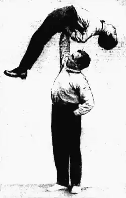 Meeske wrestled Con Keatos in a demonstration to promote the Yokel match,[176] which took place in early November 1926 and was won by Yokel, with one spot featuring Yokel pointing to Meeske's trunks to imply they were falling and tackling him when he looked.[177][178] During the match the referees shirt was ripped off when he tried to separate the fighters and Meeske tackled the referee once and threw Yokel out of the ring several times reflecting the 'all-in' nature of the match.[179] The match was well-attended and a rematch was swiftly organized for the following week, shortly before Yokel was to return to America, and tickets to the rematch sold well.[180] Yokel beat Meeske again in the match which was well received by the crowd,[181] but some felt it incorporated too much ju-jitsu at the expense of wrestling holds which was a criticism leveled at the direction professional wrestling had taken in general over the year.[182] In December Peter Limutkin challenged Meeske to a match.[183]