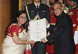 On International Women’s Day in 2013 the President of India Pranab Mukherjee presented her with the Stree Shakti Puraskar. The award was one of six made in New Delhi at the Presidential Palace - Rashtrapati Bhavan. She was nominated by the state of Maharashtra for her work in education and training.[3]