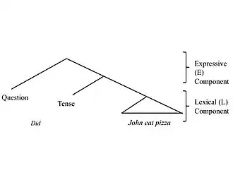 The L component words of this sentence are the content words John, eat, and pizza. Each word only contains lexical information that directly contributes to the meaning of the sentence. The L component is often referred to as the base or inner component, due to the inwards positioning of this constituent in a phrase structure tree. It is evident that the string of words 'John eat pizza' does not form a grammatically well-formed sentence in English, which suggests that E component words are necessary to syntactically shape and structure this string of words. The E component is typically referred to as the outer component that shapes the inner L component as these elements originate in a position that orbits around the L component in a phrase structure tree. In this example, the E component function word that is implemented is did. By inserting this word, two types of structures are added to the expression: tense and clause typing. The word did is a word that is used to inquire about something that happened in the past, meaning that it adds the structure of the past tense to this expression. In this example, this does not explicitly change the form of the verb, as the verb eat in the past tense still surfaces as eat without any additional tense markers in this particular environment. Instead the tense slot can be thought of as being filled by a null symbol (∅) as this past tense form does not have any phonological content. Although covert, this null tense marker is an important contribution from the E component word did. Tense aside, clause typing is also conveyed through the E component. It is interesting that this function word did surfaces in the sentence initial position because in English, this indicates that the string of words will manifest as a question. The word did determines that the structure of the clause type for this sentence will be in the form of an interrogative question, specifically a yes–no question. Overall, the integration of the E component with the L component forms the well-formed sentence, Did John eat pizza?, and accounts for all other utterances found in human languages.