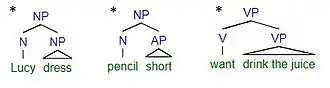 This labelling phenomenon has limitations however. Some labels can combine and others cannot. For example, two lexical structure labels cannot directly combine. The two nouns, "Lucy" and "dress" cannot directly be combined. Likewise, neither can the noun "pencil" be merged with the adjective "short", nor can the verbs, "want" and "drink" cannot be merged without anything in between. As represented by the schematic below, all of these examples are impossible lexical structures. This shows that there is a limitation where lexical categories can only be one layer deep. However, these limitations can be overcome with the insertion of an expression layer in between. For example, to combine "John" and "book", adding a determiner such as "-'s" makes this a possible combination.[41]