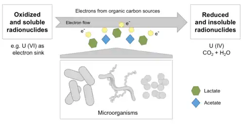 Depiction of direct enzymatic reduction. Microorganisms use organic compounds as lactate, acetate or formate as electron donors to reduce and leave radionuclides in insoluble form.[2]