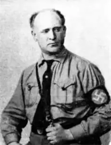 Until 1933 Furugård was the main leader of the Swedish extreme right, and he was portrayed by his followers as future Führer of Sweden (Swedish: riksledare) in the event of a Nazi seizure of power. In 1933 the second-in-command Sven Olov Lindholm formed the National Socialist Workers Party (NSAP), rapidly superseding Furugård as the most prominent Nazi leader in Sweden.[1] In the Swedish press and the public he was often called "Deje-Hitler". Furugård was later sentenced to two months in prison for defaming Criminal Police Superintendent Alvar Zetterquist.[3]