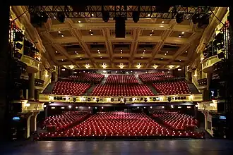 The first venue built on the Hippodrome site was a building of assembly rooms in 1895. In 1899 the venue was redesigned by local architect F. W. Lloyd, a stage and circus ring was added together with a Moorish tower (removed 1963) and the enterprise named it the "Tower of Varieties".[3] After failing, this was soon rebuilt as a normal variety theatre, reopened as the "Tivoli" in 1900, finally becoming "The Hippodrome" under the ownership of impresario Thomas Barrasford in October 1903. The current neo-classical auditorium seats 1,900 and was designed by Burdwood and Mitchell in 1924. Following the construction of the nearby Smallbrook Queensway, the entrance building and tower were demolished in 1963, and a new modern entrance constructed. At the same time, the theatre was renamed 'Birmingham Theatre' for a time.[4]