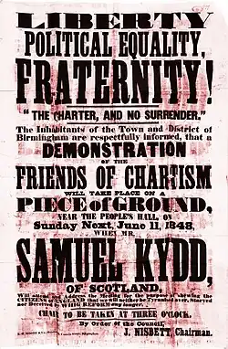 After the successful passage of the Reform Act, the Birmingham Political Union disbanded. The Union’s working class supporters "felt betrayed and frustrated by the Reform Act's failure to give them the vote".[3] The proceedings of the fourth annual meeting of the Union in September 1833 show clear signs of this frustration: "The Council are...compelled to acknowledge that the Reformed Parliament has disappointed the expectation of the people...The Reform Bill has had its trial, but what has been the fruit which it has produced?".[4] The Union demands would soon thereafter be picked up in the six points of the People’s Charter.[4]