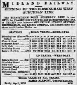 In the original plans, the line would have crossed over the Worcester and Birmingham Canal on a viaduct from the south to reach its intended Birmingham terminus at Suffolk Street station at Albion Wharf. Surviving plans for this station show it would have been built at the end of the viaduct 36 feet (11 metres) above street level; passengers would have reached the station by means of either a steep ramp or a staircase. As the promoters were unable to raise the funds to build the viaduct, the terminus was cut back to Granville Street station on the southern side of the canal, further away from the centre of Birmingham. The later Central Goods station was at roughly the location of the proposed Suffolk Street terminus, but was reached by a tunnel under the canal. The line was opened on 3 April 1876. The Midland Railway had obtained powers to take the company over, and these were exercised as soon as the line was opened.[1]