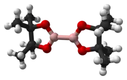 Bis(pinacolato)diboron is a covalent compound containing two boron atoms and two pinacolato ligands. It has the formula [(CH3)4C2O2B]2; the pinacol groups are sometimes abbreviated as "pin", so the structure is sometimes represented as B2pin2. It is a colourless solid that is soluble in organic solvents. It is a commercially available reagent for making pinacol boronic esters for organic synthesis. Unlike some other diboron compounds, B2pin2 is not moisture-sensitive and can be handled in air.[1]