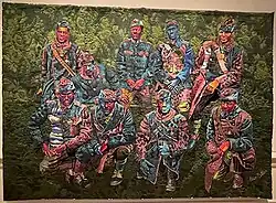 Her work, Harlem Hellfighters, was acquired by the Smithsonian American Art Museum as part of the Renwick Gallery's 50th Anniversary Campaign.[33] This work is Butler's largest quilt to date, measuring approximately 11 x 13 feet, and features nine life-sized figures.[32] The photograph Butler used for this work is a 1919 black and white photograph of the 369th Infantry Regiment, nicknamed the Harlem Hellfighters, from World War I. Butler says, "My work is to continue to lift them up in history so they can be seen in public spaces, where their heroic sacrifices become part of the American quest to fight against oppression and for freedom."[32]