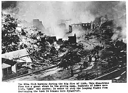 The town's geography and location caused the town to be prone to fires and floods. The Historic District experienced severe flooding in 1886, 1890, and 1908. The 1890 flood saw a 20-foot wall of water sweep through the town one night. The 1908 flood deposited several feet of mud and debris in the post office, and that same year a fire devastated the commercial area of Main Street, causing $500,000 worth of damage. Following these disasters, the town paid for flood abatement systems to be put in place, as well as a public water system to provide for fire-fighting.[5]