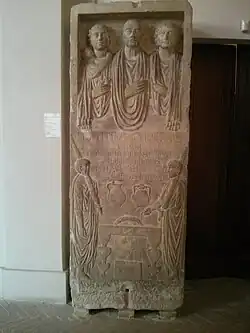 The image of an honor was frequently placed on a tomb of the biselliarius, often with an epitath recording the honor bisellii award (unlike the curule seat or fasces, images of which on the tomb were never accompanied by text).[10] A small group of reliefs includes a wreath resting on the bisellium with unclear meaning.[11]