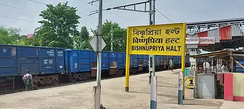 Bishnupriya railway station is a halt railway station on Bandel–Katwa line connecting from Bandel to Katwa, and under the jurisdiction of Howrah railway division of Eastern Railway zone. It is situated beside Srirampur Road at Nabadwip, Nadia district in the Indian state of West Bengal.[1] Few EMU and Passenger trains stop at Bishnupriya railway station.[2]