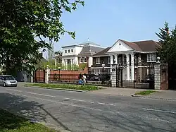 The 66-house street runs downhill north–south and with the parallel Winnington Road displays a variety of architectural styles.[4] Average property prices on the avenue surpassed £1 million in the late 1980s and each property occupies a 2–3-acre plot.[5] In 2006, the smallest houses in the street were selling for £5 million while a larger house, Turkish tycoon Halis Toprak's 30,000 sq ft (2,800 m2) Toprak Mansion,[6] sold amidst great secrecy to the president of Kazakhstan, Nursultan Nazarbayev, for £50 million in January 2008, making it one of the most expensive houses in the world, as listed by Forbes magazine.[7] Homes on the street are on the market for up to £65 million.[8]