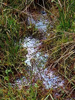 Near the springs, plants benefit from the aquifer's calcareous minerals, so the following plants grow here: marsh lousewort (Pedicularis palustris),[1][14] marsh valerian (Valeriana dioica), carnation sedge, glaucous sedge, common sedge, brown sedge, black bogrush, other cyperaceous species and bryophytes. The most common plant here is the blunt-flowered rush.[2]