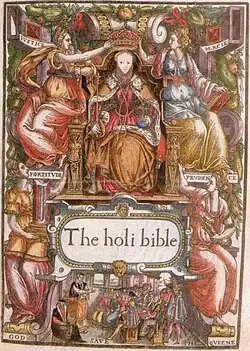 ![]() Though not formally dedicated to Queen Elizabeth, the Bishops' Bible includes a portrait of the queen on its title page. The 1569 quarto edition shows Elizabeth accompanied by female personifications of Justice, Mercy, Fortitude and Prudence. | |