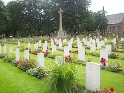 In the First World War, part of Ward 3 (Section A) of the cemetery was set apart for burials of servicemen. This plot, at a central point on the path linking the cemetery's two entrances, was extended in the Second World War. In all, 237 Commonwealth service personnel (all but about 100 of whom were buried in the plot) from the First World War and 156 from the Second are buried in this cemetery. The Commonwealth War Graves Commission are also responsible for 31 non-World War service burials and one Dutch war grave.[8] The Cemetery also contains a Cross of Sacrifice.[9]
